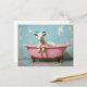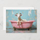 A whimsical painting featuring a white goat with horns relaxing in a vintage pink bathtub, set against a light blue wall for a charming and playful rustic scene.