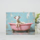 A whimsical painting featuring a white goat with horns relaxing in a vintage pink bathtub, set against a light blue wall for a charming and playful rustic scene.