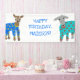 These custom party party banner features cute, realistic style illustrations of goats wearing pyjamas making it perfect for slumber parties. This banner is ready to be customised with your own message in bright blue lettering.