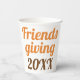 This is a Thanksgiving paper cup that's just perfect for the occasion. It has a bold and eye-catching design with the words 'Gobble 'til you wobble' written in a bold and playful font. The colours used are all inspired by the beautiful hues of autumn - think warm browns, vibrant yellows, and oranges. And to top it all off, there's a cute little turkey, adding a touch of festive cheer. On the back, you'll find the words 'Friendsgiving' along with the option to personalise it with the year.