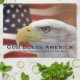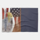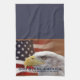 Kitchen towel shown in Deep Blue with a picture of the symbols of American Freedom, the American Bald Eagle and the United States Flag along with bold text of "God Bless America" and subtext " Land of the free and Home of the Brave". Customise this item or buy as is.
