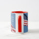 Red, white and blue mug with American Flags. One side has "God Bless America" and other side has "The Land of the Free and the Home of the Brave." Show your patriotism with this American Flag Mug! Get a matching set for everyone in the home or office. Drink your tea or coffee from this colourful God Bless America mug.