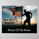 This patriotic poster says, "God Bless America Home of the Brave." It shows a picture of the silhouette of a young man in the military with his hand on a weathered American flag on top of a mountain. Behind this soldier and this flag is a beautiful sunset. This photograph was taken by my son, David Mann.