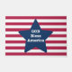 Red and white horizontal pin stripes with a big blue star and the white lettering phrase inside.