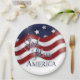 The God Bless AMERICA design has navy blue background with white stars at the top and red and white stripes in the middle.  The flag is shaded to look like a waving flag.  God Bless is on top of the flag in a hand painted look with white on bottom and navy blue on the top.  AMERICA is in all navy blue.  Great paper plates to use at your next 4th of July or patriotic party.