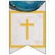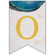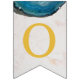 A bunting banner for religious events, recommended for boys, with white marble background, golden letters and crosses between words and blue geode agates on the upper borders. The text of the banner says "God Bless [Name]" where the name has 6 letters - the default is Oliver.