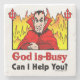 "God is busy, can I help you?" - Funny Religious Humour Saying with Satan and the fire flames of hell with pitchforks.