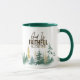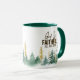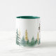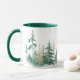 Inspirational quote coffee mug depicts a simple nature watercolor design with a forest of green and gold pine trees. It features an encouraging Christian quote, "God is Faithful All the Time."_