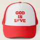 This trucker hat features a chunk five print font with red letters displaying the biblical saying "God Is Love" with the O in Love made replaced with a collection of the word Love made into a heart in this biblical saying quote theme. This hat is comfortable, casual and adjustable from 17 to 24" with a 100% nylon foam front and nylon mesh back great for everyday use or any special occasion.