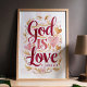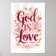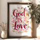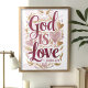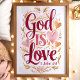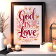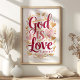 Enhance your space with this beautiful "God is Love" wall art inspired by 1 John 4:8. The design features a warm colour palette of pink and gold, with delicate hearts and foliage framing the inspiring message. Perfect for adding a touch of faith and elegance to any room, this piece is ideal for those seeking to reflect their beliefs in their home decor or to give as a meaningful gift.