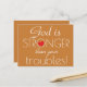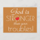 Are you looking for a beautiful and powerful Christian Faith quote postcard for someone you love? This is a gorgeous dark beige colour inspirational postcard that says: 'God is STRONGER than your troubles!' printed in white letters. A cute red heart is inside the letter 'O' to represent God's LOVE and strength.