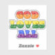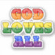 Features the words "God Loves All" with paisley-designed text in the colors of the rainbow Pride flag. Perfect for a Christian (or a person of any faith) who is queer/LGBTQIA+, or for their family, friends, and allies.