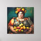 "Goddess of Overindulgence" Colourful Portrait. A mischievous nod to classical depictions of earth goddesses, this portrait transforms the symbolism of fertility and harvest into a wry commentary on modern consumption and identity. Rich textures and theatrical styling lend timeless weight to its satire. With apples, pears and grapes in vibrant colours of yellows, greens and reds.