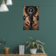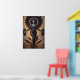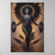 A divine figure embodying the duality between light and darkness. With imposing wings and a golden halo, she raises black circles as bearers of secrets, while flaming leaves emerge from her legs, symbolising rebirth. The palette of blacks and golds creates a mystical and powerful atmosphere, perfect for those seeking a piece that dialogues with mythology and spirituality. Ideal for spaces that value drama and symbolism, this work transforms walls into portals of ancient legends, inspiring admiration and reflection.
