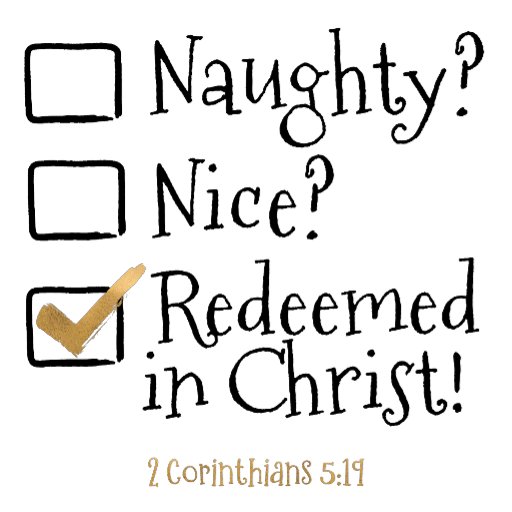 Unlike Santa, God's favour cannot be earned! God's standard of goodness is Christ's imputed perfect righteousness--an undeserved gift of saving grace and His eternal forgiveness freely offered to those who receive it by faith! This eye-catching Christian men's short-sleeve Christmas t-shirt features a playful spin on Santa's checklist that reads: "NAUGHTY? NICE? REDEEMED BY CHRIST!" along with the 2 Corinthians 5:19 bible address. Wear your joy in the Good News that Christ's redemptive gift to sinful humanity--first heralded by angels at His miraculous birth--is the reason Christians around the world celebrate the Christmas season without worrying if we've been good enough all year to receive God's approval.