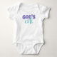 T-shirt for baby " God's Gift ," designed by HAMbyWhiteGlove aka HAMbWG shown with purple and aqua text on a white t-shirt