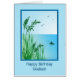 A lovely sea fishing scene. A wonderful birthday card for a godson who loves fishing, or just loves the sea. Tall grasses frame a view of a calm ocean with a small boat and a man fishing. The inside verse has the fisherman's good luck wish 'tight lines'.