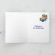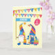 A fun birthday card for a godson that you can customize with his age. The front cover has two cute gnomes, one holding a banner that says, 'GODSON' and the other is holding a red balloon where you can add your godson's age. The gnomes are based on the 'tomte' of Scandinavian folklore, the male with a long white beard and the female with thick blond plaits, or braids. They both have very tall hats that cover their eyes; they have big noses and they are each carrying a gift box as well as the banner and balloon. 'Happy Birthday' is spelled out in white letters on the colorful bunting at the top and the background color is a very pale , sunshiny yellow. The inside message is just a suggestion and you can easily change it or delete it if you wish.