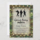 Personalised military party invitations to celebrate a soldier going away on national service, or to celebrate them coming home. Featuring a camouflage background, a vintage overlay centrepiece, marine troops, string lights, and a modern party template.