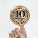 Gold foil style 10th-anniversary sticker with the business logo. Commemorative design with a laurel branch and stars. The logo can be changed for text by clicking the button to edit the design.
