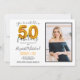 Celebrate your milestone birthday with this customisable 50th birthday invitation. The card features a place for you to upload your photo, add your name, the date, and location with RSVP information. The design is elegant with 50 in a gold balloon style font.