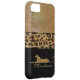 Stylish iPhone 5C case done in solid black, on the bottom half of the case and graphics of a gold glitter look, on the top half. Graphics of a tan, brown and black leopard spotted ribbon, runs across the middle and a leopard decorates the black bottom of the case. Personalise the tan text to read what you want. Great personalised gift idea.