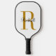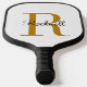 This modern pickleball paddle design features a clean white background with your monogram initial in gold text and your name in black text for a look that is trendy and elegant, yet professional. Design on both sides of paddle. Easy to customise. Golf in style. Get yours today!