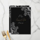 Gold and Black Wedding Reception Menu Card designed with white and gold coloured text on a black background with white accents. The text includes: the Bride and Groom's First Names and Wedding Date. The reverse side includes: Appetizer Selections, Entre Selections and Dessert Selections. To personalise, simply insert your menu selections into our easy template, replacing the sample text. Be sure to view the entire Gold and Black Wedding Collection for matching cards and accessories.