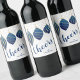 Create your own personalised wine bottle labels to give as holiday gifts or favours! Dark blue and gold Christmas tree ornaments with your details in chic lettering make your wine gift stand out. MATCHING invitations and more in our collection.