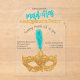 A very elegant mask in golden dust with a sparkling turquoise blue feather decorates this subtle elegant Mardi Gras invitation.