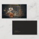 Define your brand with dramatic high-end elegance and mysterious charm using this captivating business card. The design is set against a deep matte black backdrop that provides maximum impact for the central gold structure. At the bottom, a subtle twilight landscape featuring distant mountains and a reflective body of water adds an atmospheric touch. The focal point is a beautiful, layered geometric gold frame surrounded by stylized flowers and leaves. The flowers—including a striking copper-toned rose and creamy white blossoms—are rendered with delicate detail and metallic texture, highlighted by warm gold and copper accents. This stunning aesthetic blends sharp, modern lines with opulent, romantic florals, creating a truly memorable and luxurious brand statement. This business card is ideally suited for a high-end jewelry artisan specializing in copper or gold-themed pieces, a luxury event stylist focused on moody, metallic themes, or a boutique hotelier wanting to convey a picturesque, tranquil setting. It would also perfectly suit a corporate executive who requires a distinctive, prestigious contact card, or a modern floral designer emphasizing dramatic, contrasting palettes.