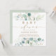 This baby shower square invitation features painted watercolor eucalyptus, botanical green and gold glitter leaves with gold script.