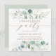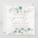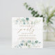 This engagement party square invitation features painted watercolor eucalyptus, botanical green and gold glitter leaves with gold script.