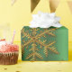 This Christmas wrapping paper features a green and gold design, with a pattern of striking metallic gold Christmas decorations over a green gradient background. There are large gold snowflakes, golden holly leaves, a little gold Santa and his sleigh being pulled by reindeer, and a very festive greeting of 'Merry Christmas'.