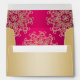Gold look hued envelope with an exotic Indian inspired ornamental sari MEDALLION pattern WITH A FLORAL AND LOTUS SUNBURST DESIGN in Hot pink fuchsia and gold on the inner flap of the envelope. This elegant and beautiful modern Indian style wedding invite is perfect for any formal occasion WITH AN EAST ASIAN INDONESIAN MOROCCAN ALADDIN OR ARABIAN NIGHTS THEME. Designed by Chrissy H. Studios, LLC. All Rights Reserved.