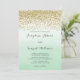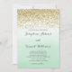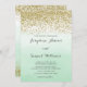 Wedding invitation with faux gold glitter design and mint green ombre watercolor background.