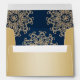 Gold look hued envelope with an exotic Indian inspired ornamental sari MEDALLION pattern WITH A FLORAL AND LOTUS SUNBURST DESIGN in a sapphire navy dark blue and gold on the inner flap of the envelope. This elegant and beautiful modern Indian style wedding invite is perfect for any formal occasion WITH AN EAST ASIAN INDONESIAN MOROCCAN ALADDIN OR ARABIAN NIGHTS THEME. Designed by Chrissy H. Studios, LLC. All Rights Reserved.
