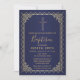 Gold and navy vintage Baptism invitation. Design features of vintage gold frame and cross on a navy background. Click customise further to edit font/ colour/ style or move text etc.