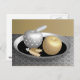 Gold and silver Christmas apples on a silver platter on a silver lace tablecloth with a gold damask background