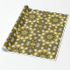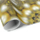 A golden Christmas wrapping paper with a kaleidoscope pattern of glittering gold and silver Christmas baubles forming a very decorative, elegant wrap.