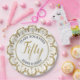 Celebrate the happy couple with this elegant gold and white 50th anniversary paper plate, text and font are easily customisable when you order