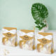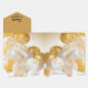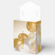 Large tent-style party favour box 4" wide x 2" long x 5" high is covered with gold and white balloons, confetti and streamers. Fill with treats for guests to a birthday party, 50th birthday party, milestone birthday, 50th anniversary party, business party, New Year's Eve party and more. SMALLER size plus MATCHING items in our collection.