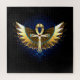 Golden Egyptian ankh with patterned, shiny wings on a black background. Magic symbol.