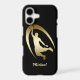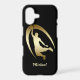 This phone case designed for the basketball player or fan features a gold silhouette basketball player dunking the ball, with a gradient gold swoosh design behind him. A text field allows you to personalise it. The image and text are placed on a black background. *Clip art used in this design is copyrighted by Encore Software, Inc., which permits use to its licensors. All rights reserved.