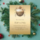 An invitation for a Christmas Party. A faux gold looking background. Decorated with a large golde vintage looking bauble. Personalise and add the details. Black text.