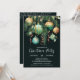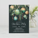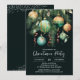 Elegant Christmas holiday party invitations feature pine branches, green and gold Christmas ball ornaments and ribbons on a black background with your details in chic lettering, perfect for your festive holiday gathering. MATCHING items in our collection.