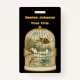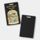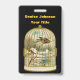 This name or identification badge is black with a gold and white birdcage that has a winter cabin by a stream and a bird on a branch inside the cage. Customise your name and information with the templates.