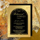 A festive rehearsal dinner invitation featuring a gold and black design with confetti sparkles.