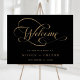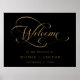 This gold and black wedding welcome sign (poster) featuring elegant and romantic swirly calligraphy lettering with a formal script. For more advanced customisation of this design, please click the BLUE DESIGN TOOL BUTTON above!