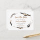 A convenient way to ask your guests to save the date is via postcard. This elegant design has a Boho black and gold feathery leaves design on a geometric frame bordering black and gold typography. Text is easily personalised and the background and text colours can be changed if you so wish